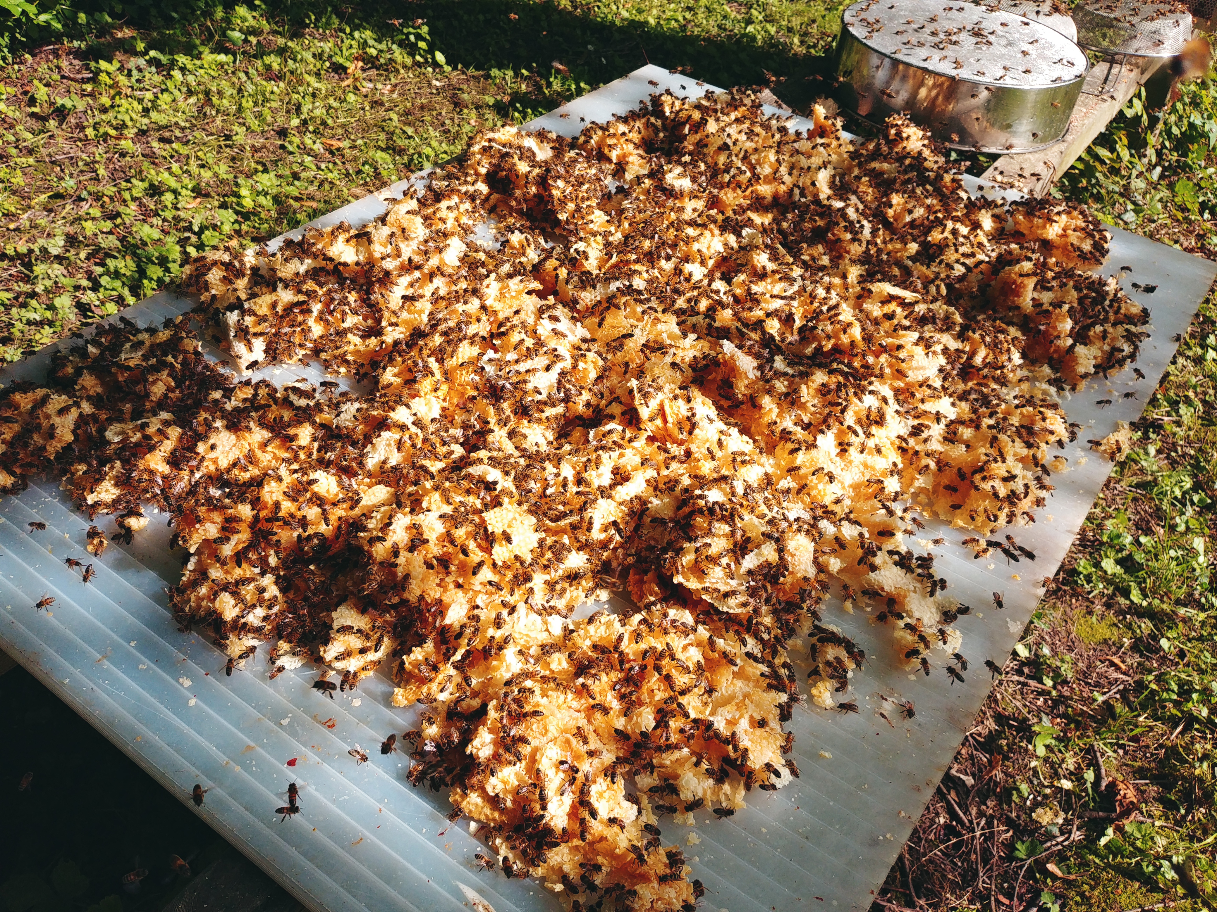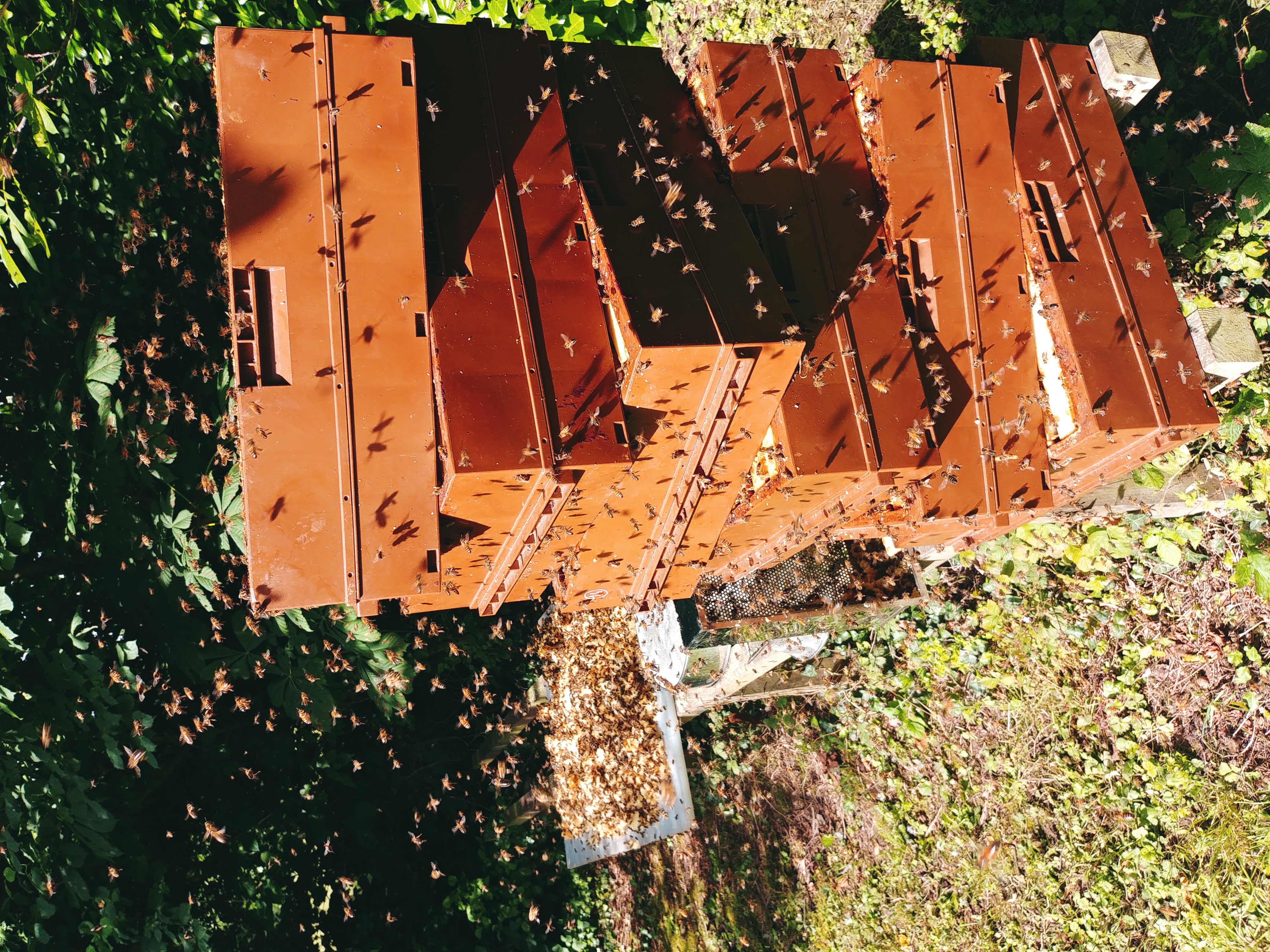 Lors de mes manipulations, les hausses ne sont jamais posées sur le sol, j'ai pour cela 2 petites tables d'une hauteur de 50cm qui me suivent. Même chose pour les cadres que je sors de la ruche, il sont posés sur un support que je mets sur le coté de la ruche visitée.