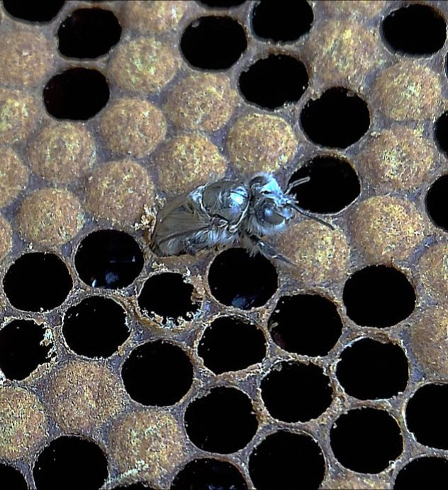 Couvain et naissance d'une abeille (certaines naissances ont déjà eu lieu)